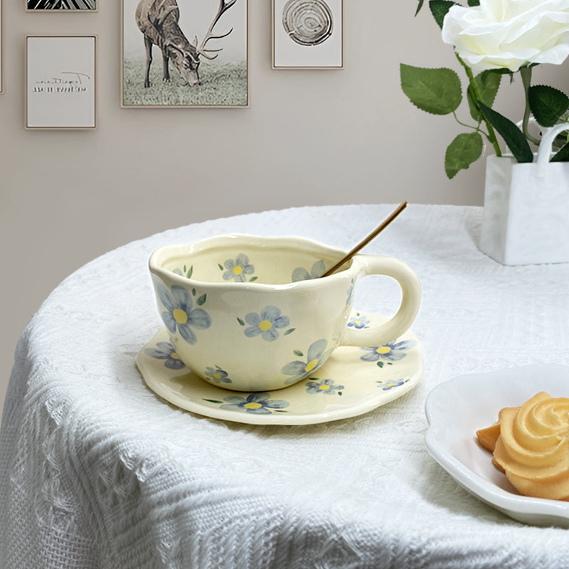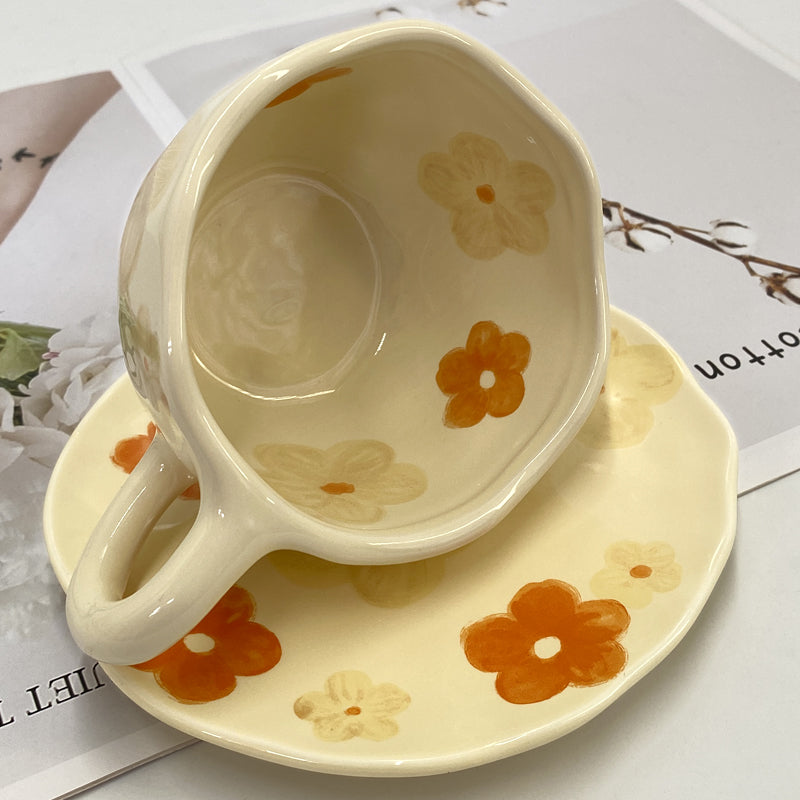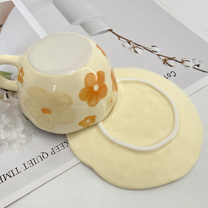 Hand-Kneaded Ceramic Coffee Mug Saucer Spoon Set Creative Floral Design Breakfast Afternoon Tea Cup With Dish